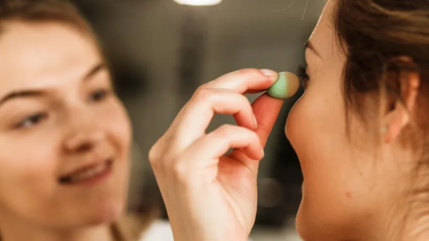 Después de aplicar el contorno en el rostro y también la nariz, vamos a aplicar un producto muy conocido por todas, como es el corrector de ojeras. Lo vamos a hacer en las ojeras con una pequeña esponja.