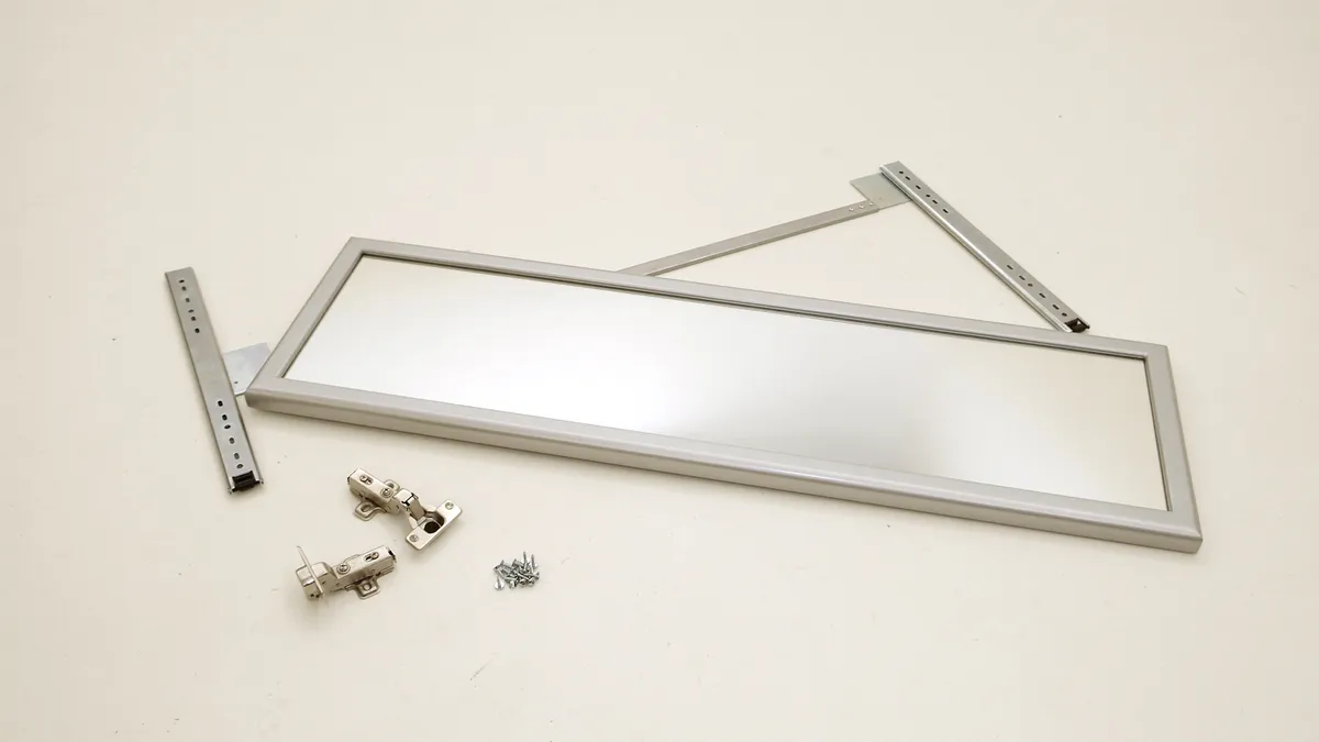 Por último, debes colgar el espejo en su posición, sujetándolo con las dos bisagras de cazoleta que hemos colocado, y lo encajamos en el carril.