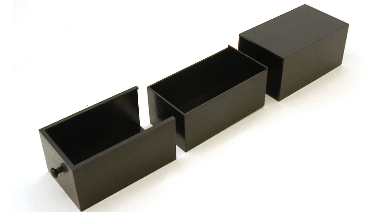 La pintura de las tres cajas que componen la caja mágica ya está seca: colocamos el tirador en el primer cajón e introducimos los dos cajones restantes.