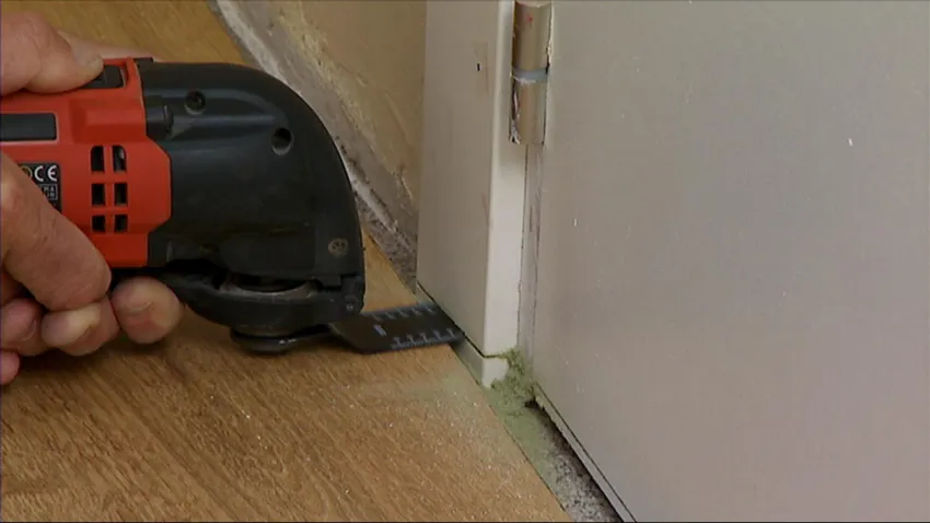 Lo primero que tenemos que hacer es marcar con un lápiz por donde debemos cortar la jamba. Cortamos la parte inferior de la jamba con la ayuda de la multiherramienta provista de un disco para madera. A continuación, limpiamos bien la superficie.