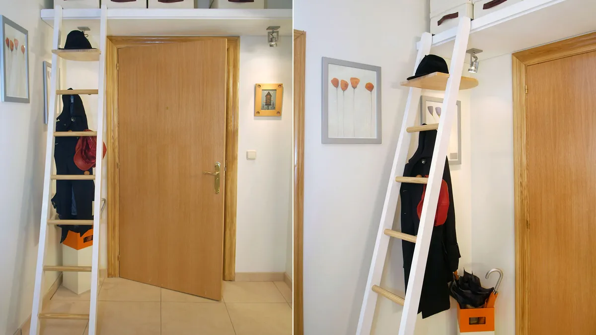Ahora sólo nos queda colocar la escalera en su posición y fijarla al altillo con las escuadras metálicas. De este modo, habremos construido una escalera perchero de madera que nos permitirá llegar fácilmente al altillo o zona de almacenaje que tenemos en el recibidor de nuestra casa. Además, gracias a los colgadores que le hemos añadido, nos servirá también de práctico perchero.