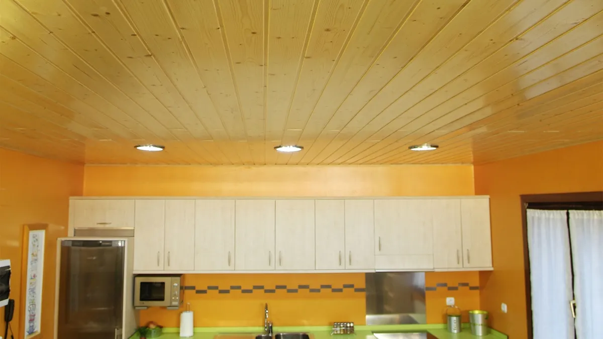 Instalar un friso en techo de cocina, nos dotará la estancia de una mayor iluminación y calidez, cambiando su aspecto.Lo que haremos será revestir el techo de nuestra cocina con un friso de madera de abeto barnizada y colocaremos, a partir de un punto de luz ya existente, varios focos encastrados. Carpintería y electricidad, unos trabajos fáciles de realizar y con resultados realmente espectaculares.
