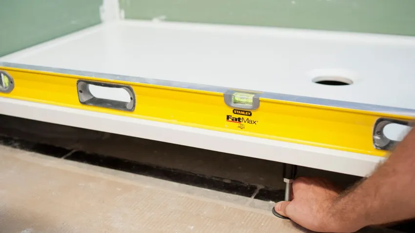 Si el plato de ducha cuenta con patas regulables, colócalas y ajusta su altura hasta que quede perfectamente nivelado. Sitúa el plato sobre el suelo y ve regulando las patas poco a poco hasta asegurarte de que la superficie esté completamente nivelada.