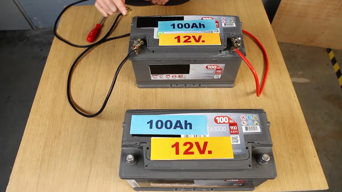 De esta manera, conseguimos una tensión de salida total de 24 voltios y una capacidad de 100 Ah (amperios por hora), sin cambios.
