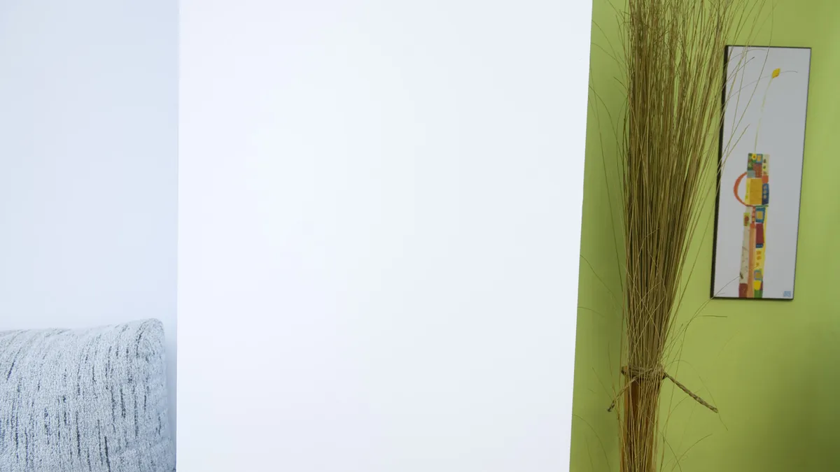 Cuando el producto se haya secado, daremos dos manos de una pintura acrílica, con acabado mate, y del mismo color que ya tenemos aplicado en la pared.