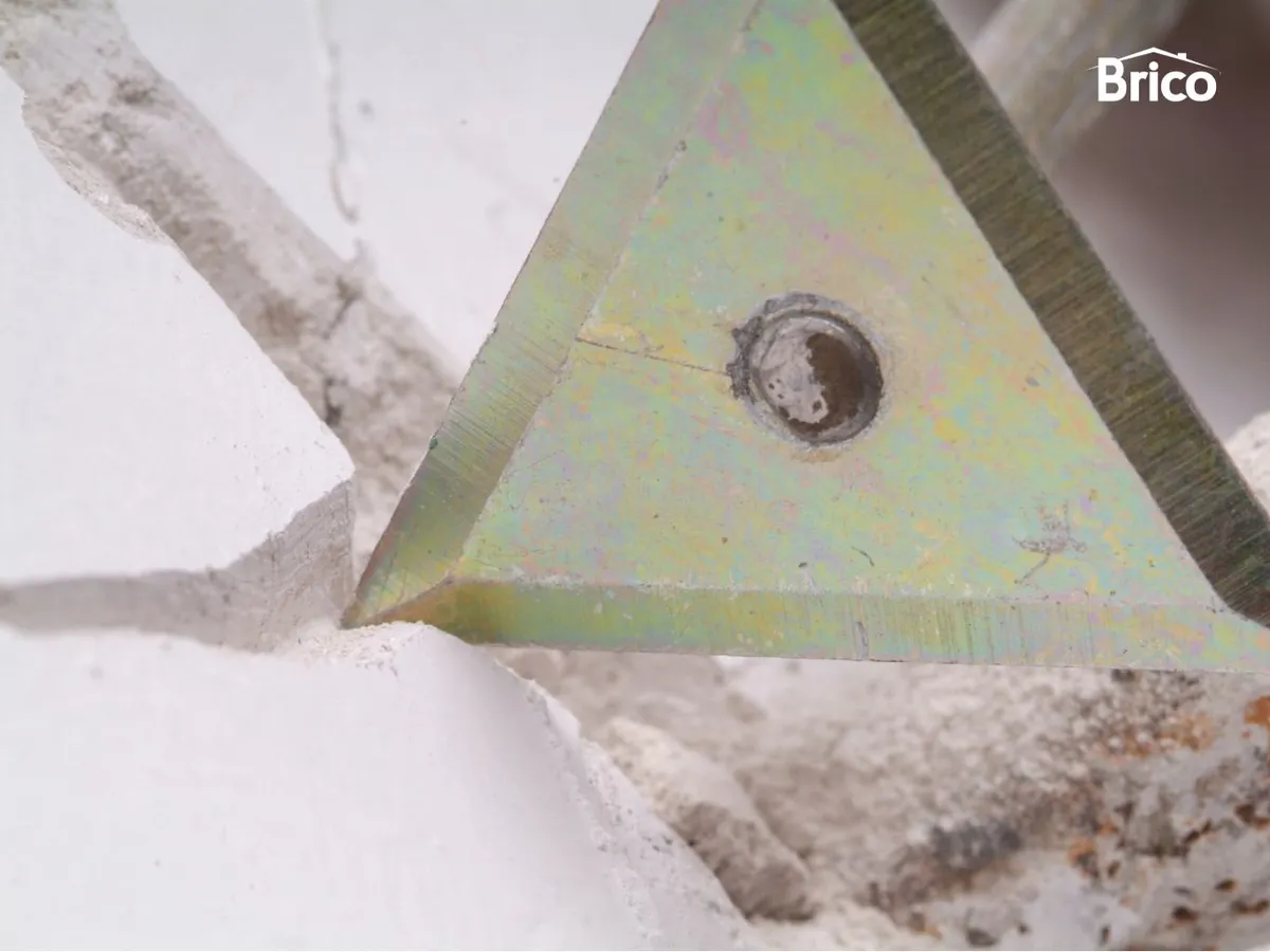 A continuación, abre la grieta en forma de 'V' con una espátula o una rasqueta triangular. La parte interior de la fisura debe ser más estrecha que la exterior. Este paso es fundamental para asegurar una buena adherencia de la masilla.