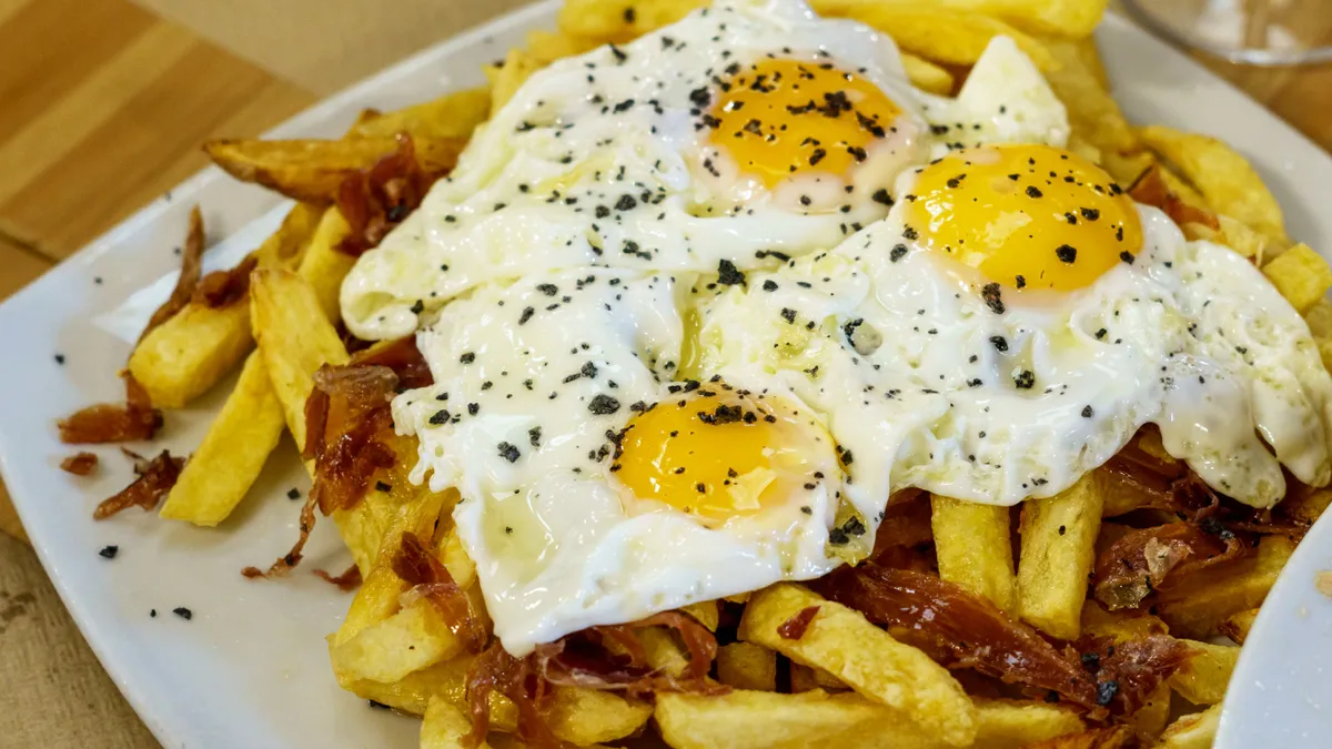 Hay gestos que resumen lo que significa comer bien. Romper un huevo sobre unas patatas recién fritas, ver cómo la yema se desliza y lo tiñe todo de dorado, es uno de ellos. No hace falta nada más: solo pan, buena compañía y ese instante de silencio que siempre precede al primer bocado.