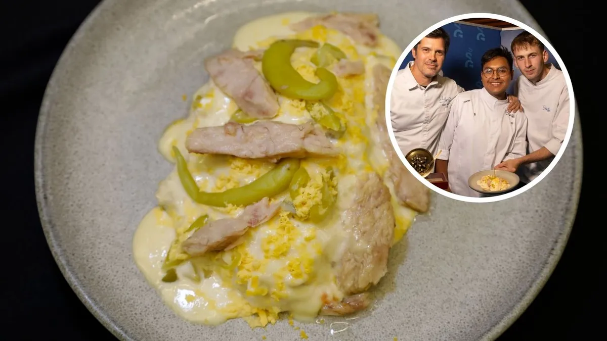 Detrás del plato están Pablo Vicari, jefe de cocina de Elkano, y los cocineros José Manuel Barroso y Jonathan Canahuire, responsables del servicio en el bar.