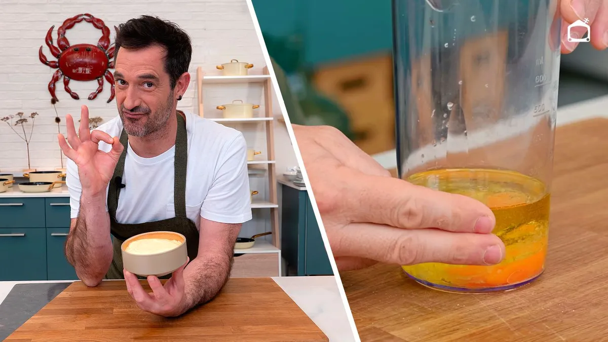 Hace poco más de 25 años, Joseba Arguiñano hacía su debut en televisión junto a su padre, Karlos Arguiñano, precisamente con esta misma receta de mayonesa. Hoy demuestra que no ha dejado de aprender para descubrir sus propios trucos y métodos hasta dar con la clave y demostrarnos que «no hay excusa para no hacer mayonesa».