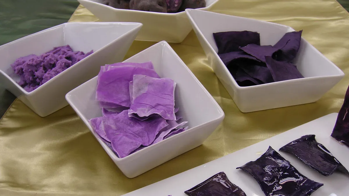 Puré de patata azul: Envolver la patata en film de cocina y cocer en el microondas. Pelar, machacar hasta hacerlo puré y condimentar con aceite, sal y jengibre.