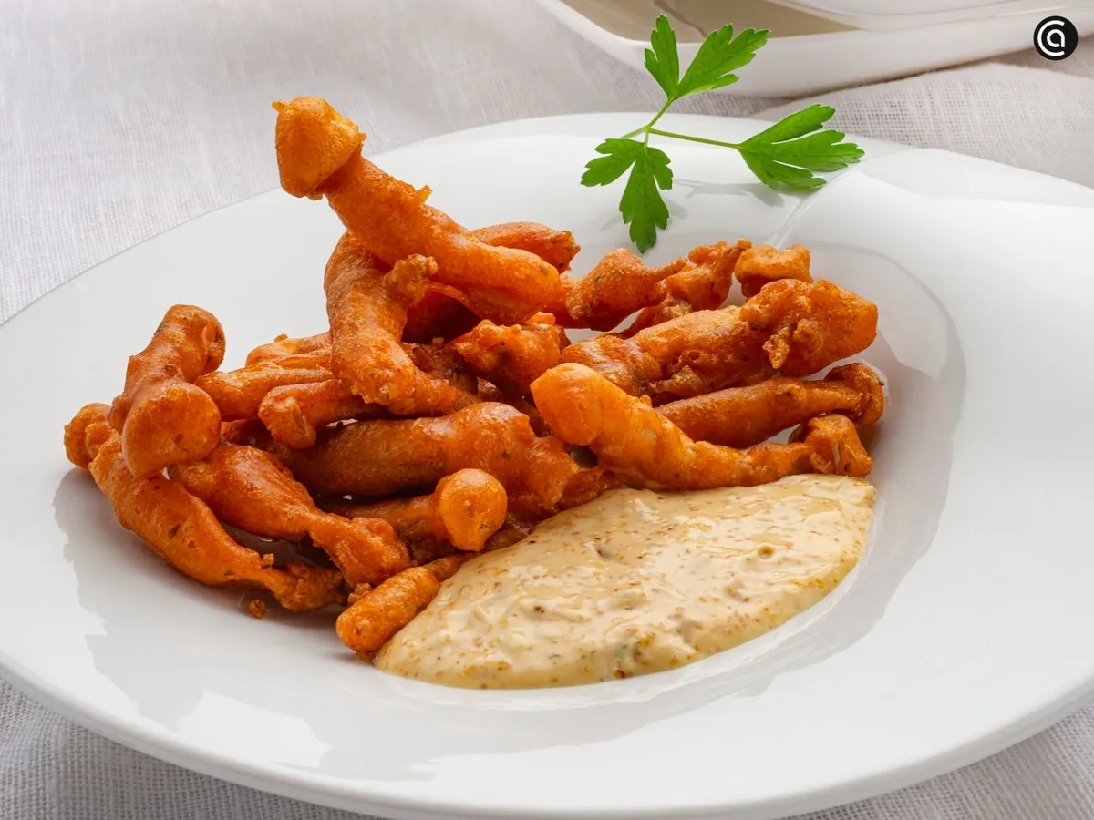 Reparte las setas en tempura en 4 platos y acompaña con la salsa crispy. Decora con perejil.