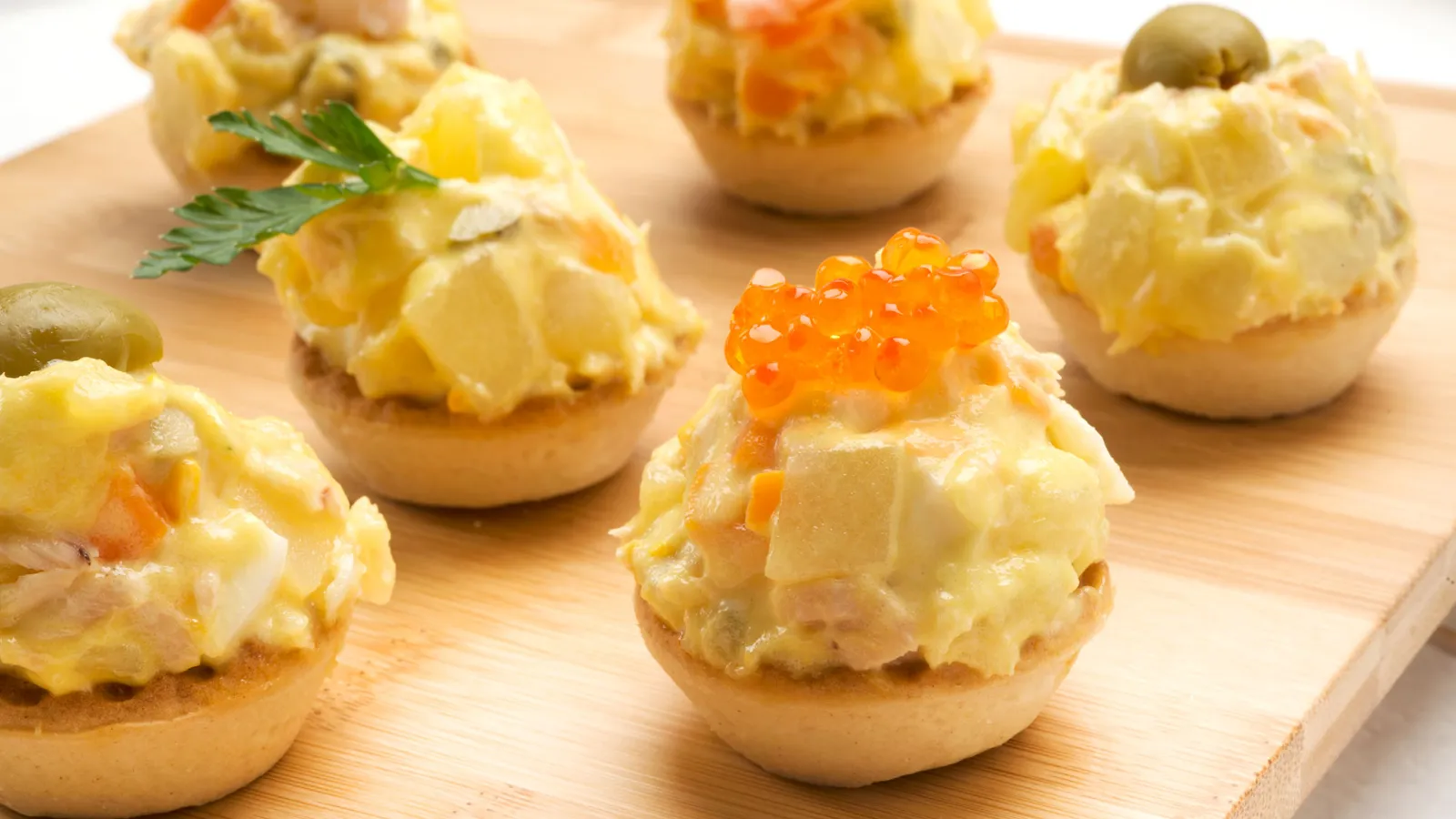 Tartaletas de ensaladilla rusa, una tradicional receta de pasta brisa rellena de ensaladilla elaborada con mahonesa casera ¡imprescindible en las citas navideñas!