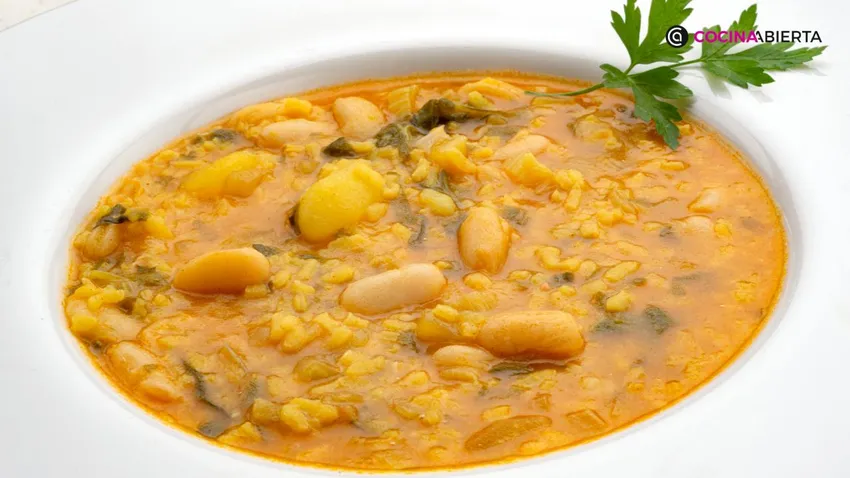 Esta cazuela combina arroz, acelgas, alubias blancas y patatas. Gracias a que solo contiene ingredientes vegetales, suele consumirse durante la Cuaresma.