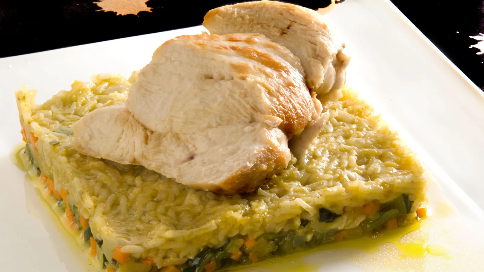 Emplata con ayuda de un molde cuadrado hueco. Pon en la base las verduras salteadas y encima el arroz y la pechuga. Presiona bien y riega con el jugo de la pechuga. Sirve.