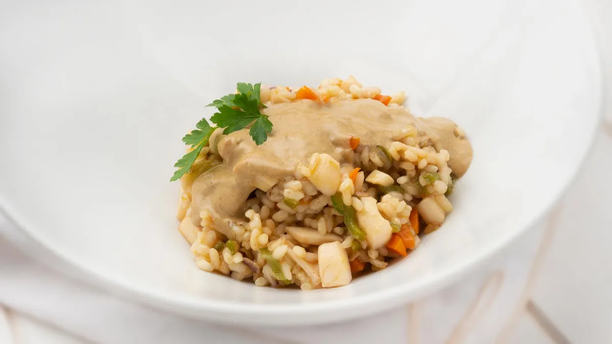 Sirve el arroz y acompáñalo con la mahonesa de ajo negro. Decora los platos con unas hojita de perejil.