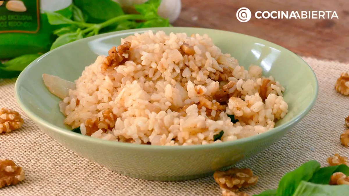 Cocemos en primer lugar el arroz para después acompañarlo de un sofrito de cebolla, el intenso sabor de la albahaca y el contraste de las crujientes nueces. Recomendamos no escatimar a la hora de incorporar ingredientes ya que otorgarán mucho más sabor al resultado final.