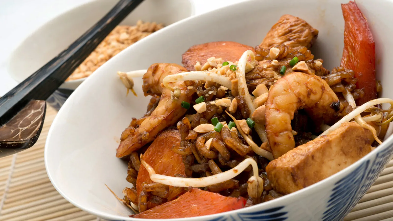 Receta de arroz tailandés de Karlos Arguiñano. Se trata de un plato oriental de arroz con pechuga de pollo, gambas, verduras y brotes de soja salteados en el wok.