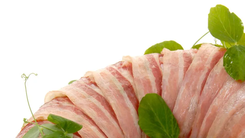 Forra con las lonchas de panceta un molde con forma de corona (dejando que sobresalga la panceta, para luego cerrar) y rellena con el arroz y los guisantes, presiona un poco y cubre con la panceta. Hornea a 180ºC. durante 10-12 minutos (hasta que se dore la panceta).
