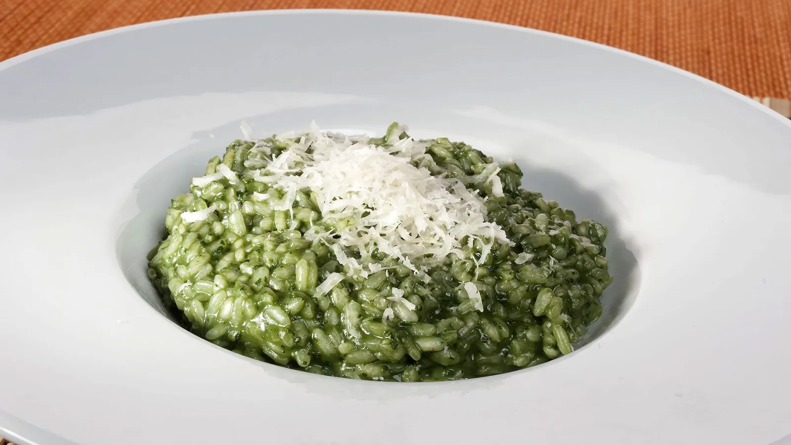 Receta de risotto de espirulina y ortigas con queso parmesano, un plato cocinado con superfoods o superalimentos por Guty Carvajal.