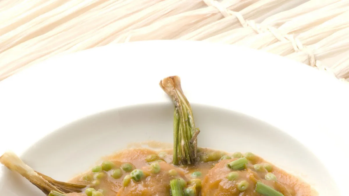 Sirve seis albóndigas con la salsa de guisantes en un plato y acompaña con los ajetes y las cabezas reservadas.
