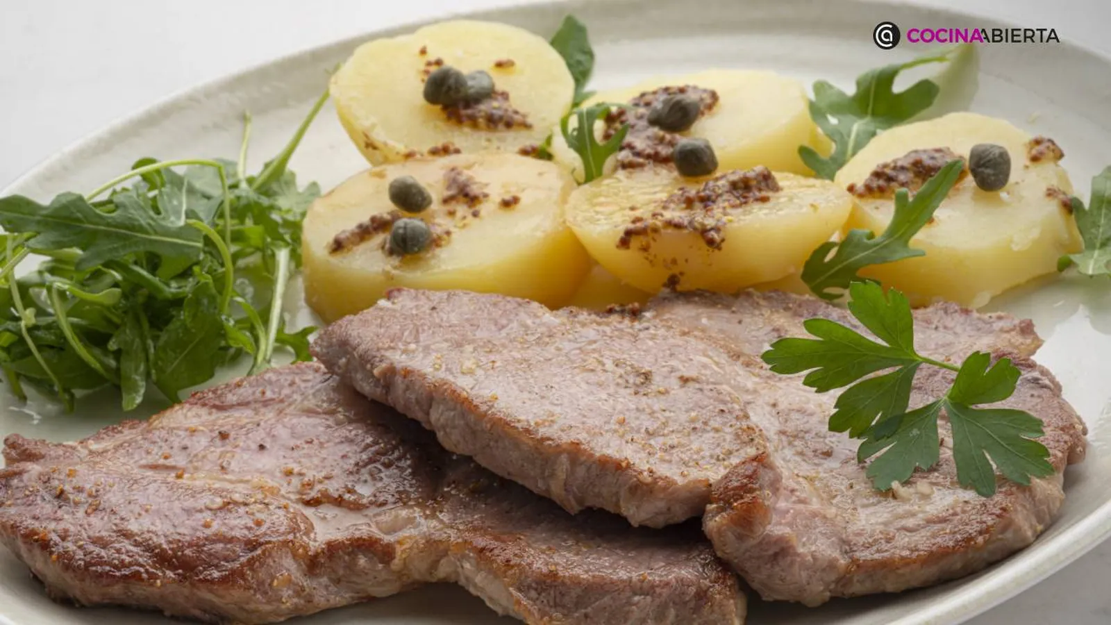 Compartimos una receta de carne de cerdo jugosa y sabrosa: Cabezada de cerdo con patatas, mostaza, alcaparras y rúcula, un plato de carne sencillo y fácil de preparar siguiendo el paso a paso de Karlos Arguiñano.