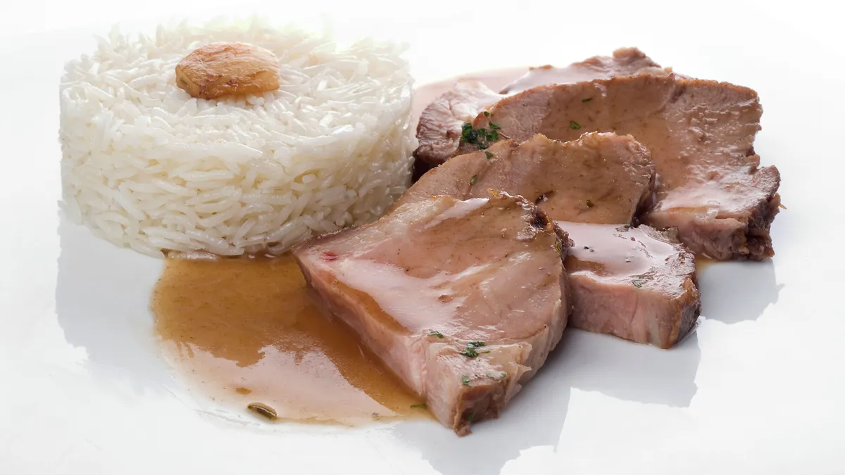 Receta de carne macerada con arroz, un plato realizado con cabeza de cerdo macerada con vermut y especias, acompañado de arroz y ajos. Receta de Bruno Oteiza.