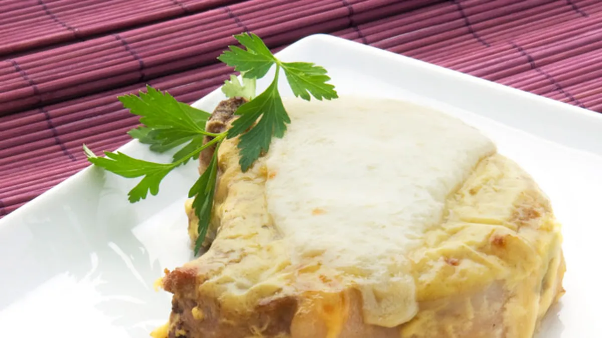 Receta de chuletas de cerdo con crema y queso, un plato de carne asado con bechamel y queso y servido con patatas y ajos fritos, de Karlos Arguiñano.