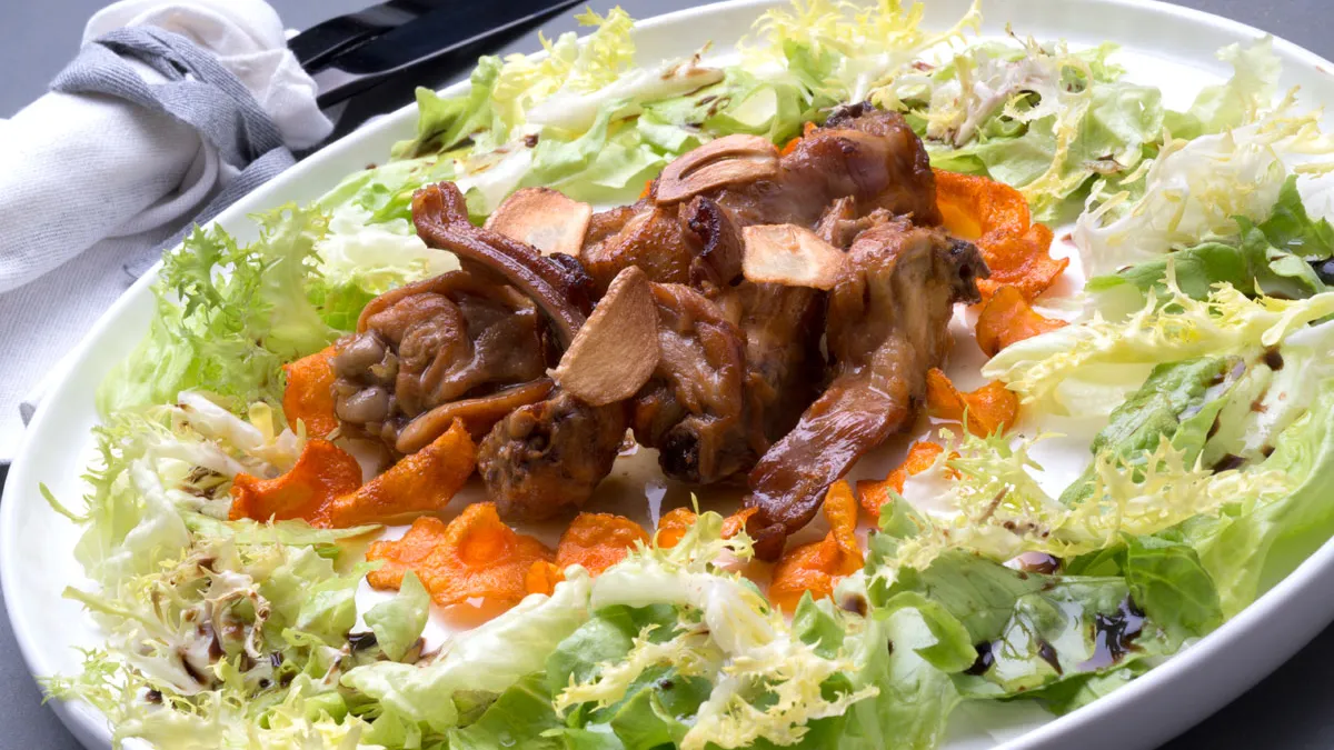 Receta de Karlos Arguiñano de conejo al ajillo acompañado de chips de zanahoria y ensalada verde.