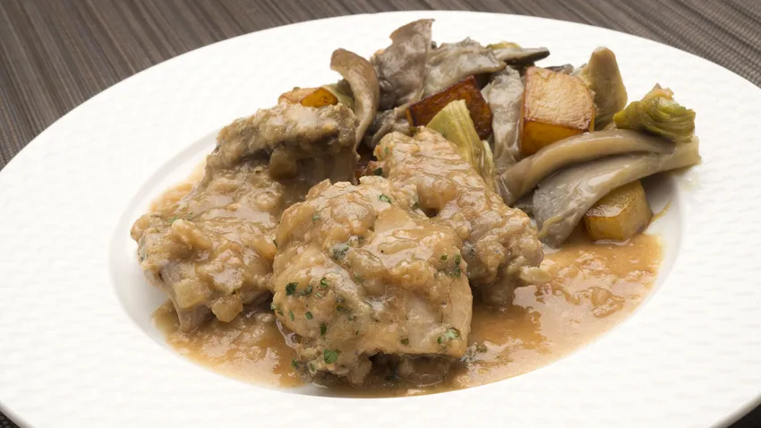 Karlos Arguiñano elabora un guiso de conejo en salsa de almendras con guarnición de setas, patatas y alcachofas.