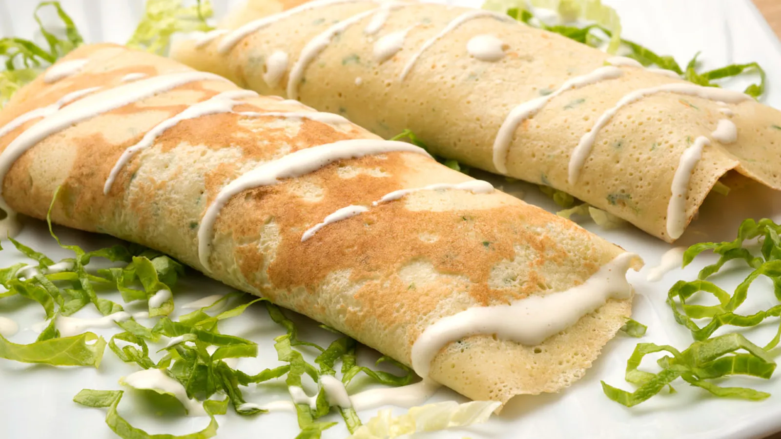Sirve los crepes y acompaña con el resto de lechuga. Decora con unos hilos de mahonesa.