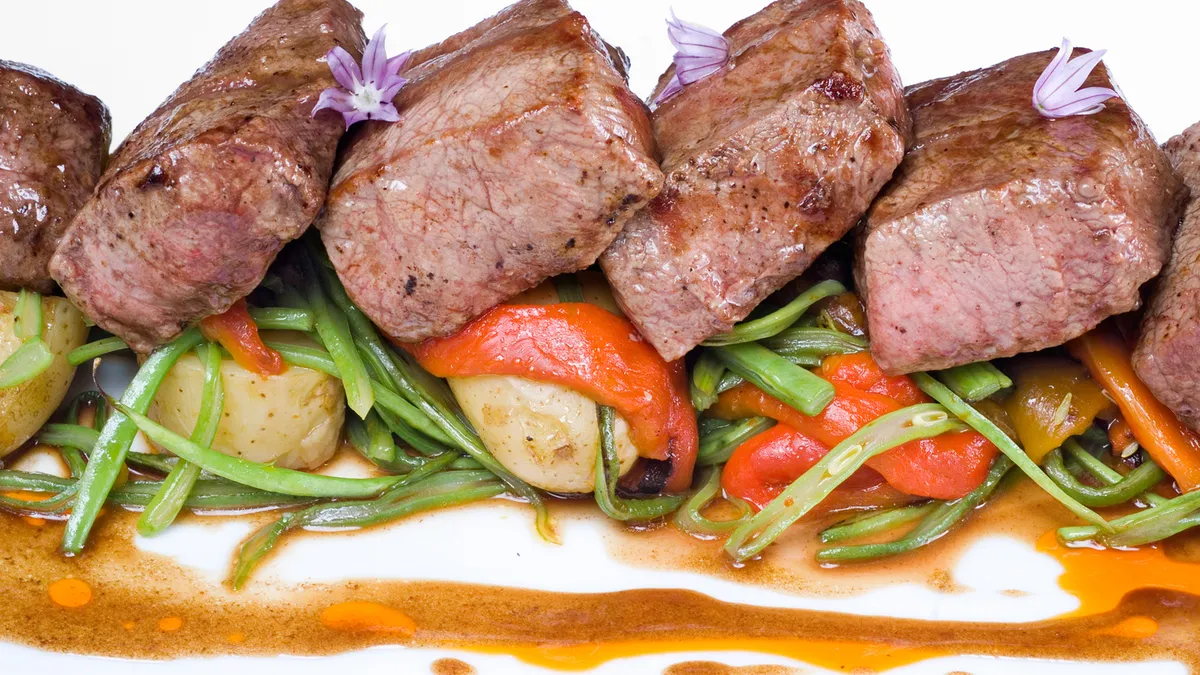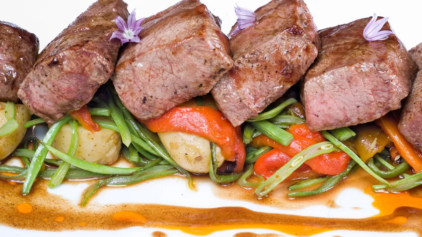 Salpimienta los trozos de carne y ásalos a la plancha con un chorrito de aceite. Sirve los trozos de carne encima de la guarnición de verduras. Salsea con el jugo de carne y decora con una flor de cebollino.