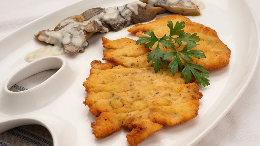 Elaboración de la receta Filetes de pavo empanados con setas al Roquefort:
