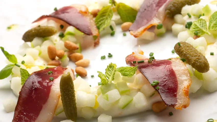 Jamón de pato al pimentón con ensalada de queso, manzana y pepinillo