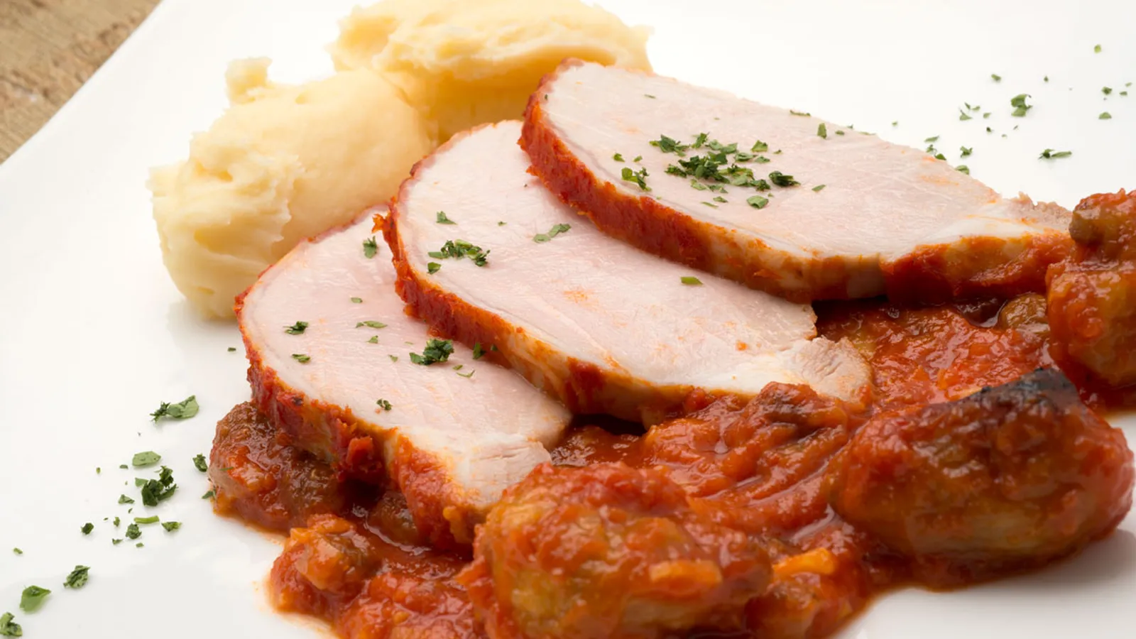 Receta de Karlos Arguiñano de lomo de cerdo al horno acompañado de puré de patatas y salsa de tomate con higos secos y uvas pasas.