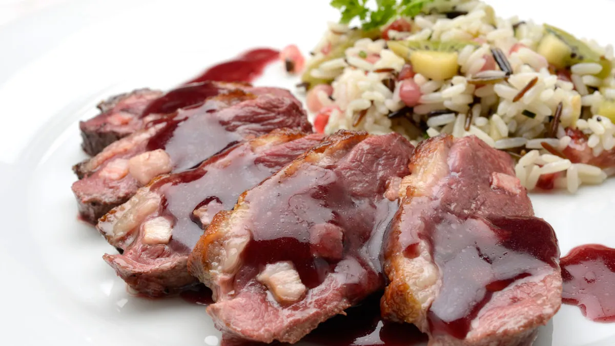 Receta de Karlos Arguiñano de magret de pato mechado acompañado de frutas y arroz salvaje, un plato ideal para Navidad.