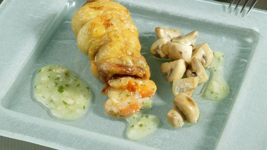 Receta de muslo de pollo relleno de jamón y queso, Karlos Arguiñano prepara pollo asado con queso y jamón, acompañado de champiñones y salsa de cebolla.