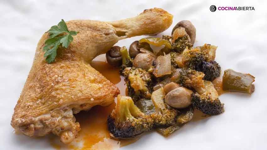 Y dado que las recetas con muslos de pollo suelen ser mucho más jugosas que las pechugas, os proponemos degustarlas sobre unacama de verduras guisadas. Nosotros hemos optado por brócoli, champiñones, pimiento y cebolla, pero podéis escoger cualquier otra verdura que os guste (coliflor, coles de Bruselas, zanahorias o cualquier otra de temporada que os apetezca).