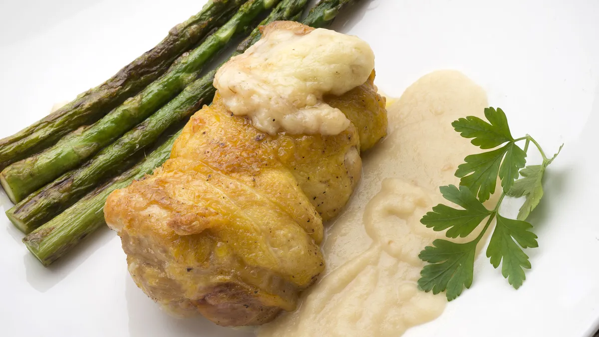 Karlos Arguiñano elabora una receta de muslos de pollo rellenos de jamón y queso asados en el horno y acompañados de salsa de manzana y espárragos verdes a la plancha.