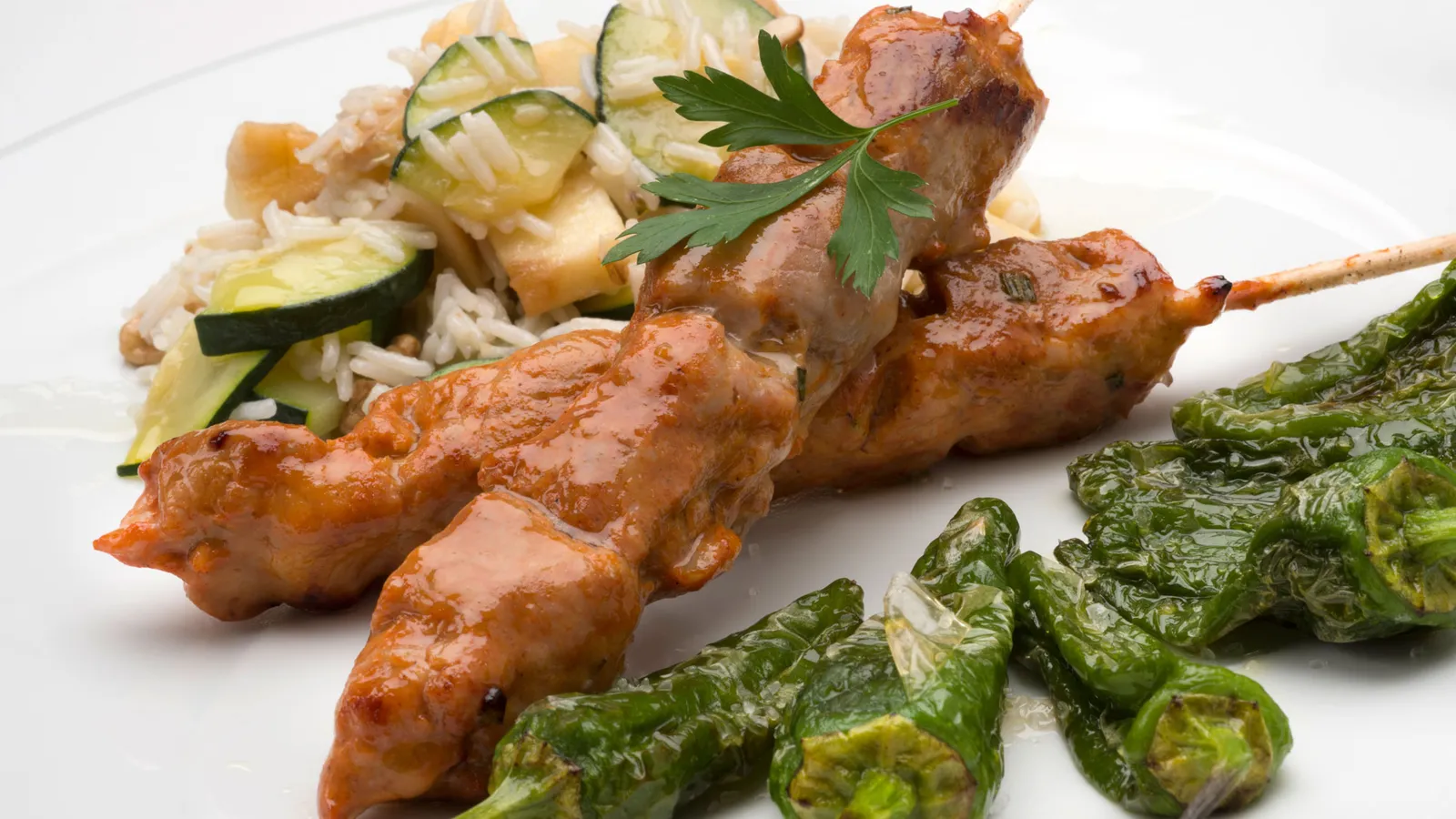 Karlos Arguiñano prepara un plato de pinchos o brochetas de cerdo a la plancha acompañadas de arroz con calabacín y pimientos verdes fritos.