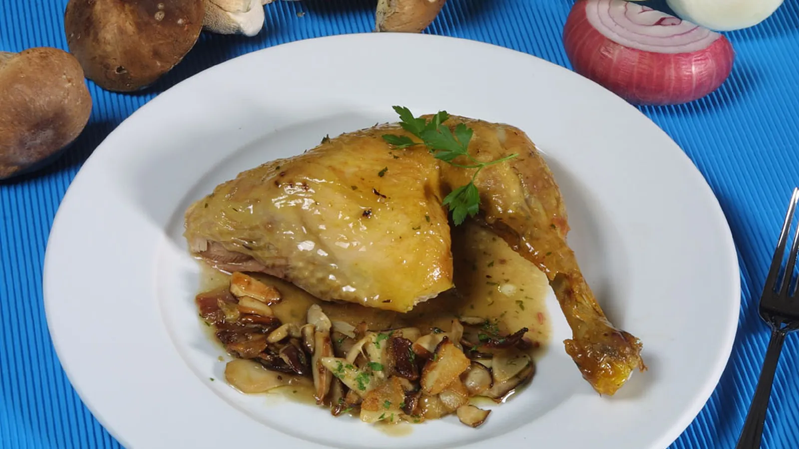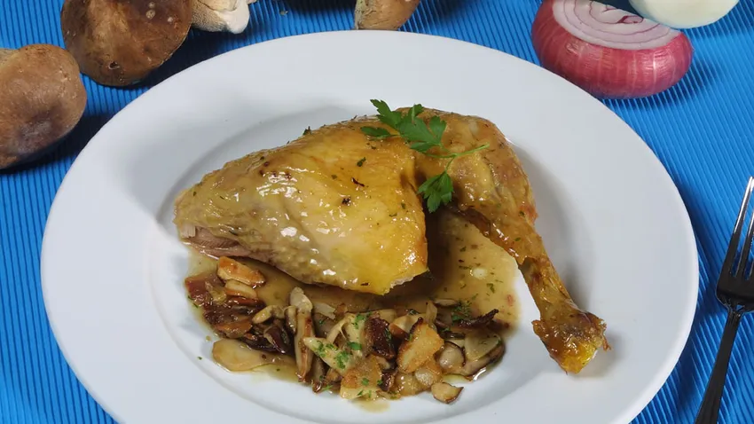 Receta de pollo asado con finas hierbas, un plato clásico y rico con pollo cocido al horno y acompañado de panceta y hongos. Receta de Karlos Arguiñano.