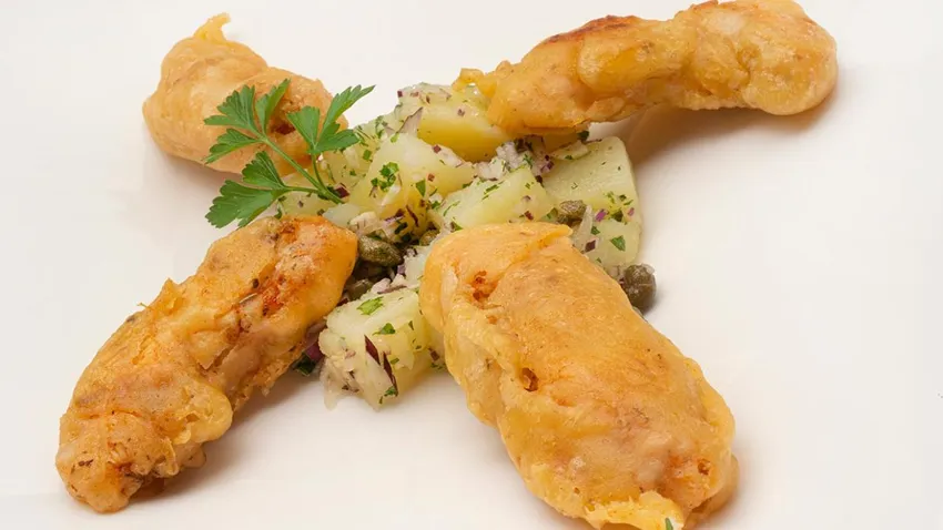 Presentación de la receta Pollo gabardina con patatas aliñadas: