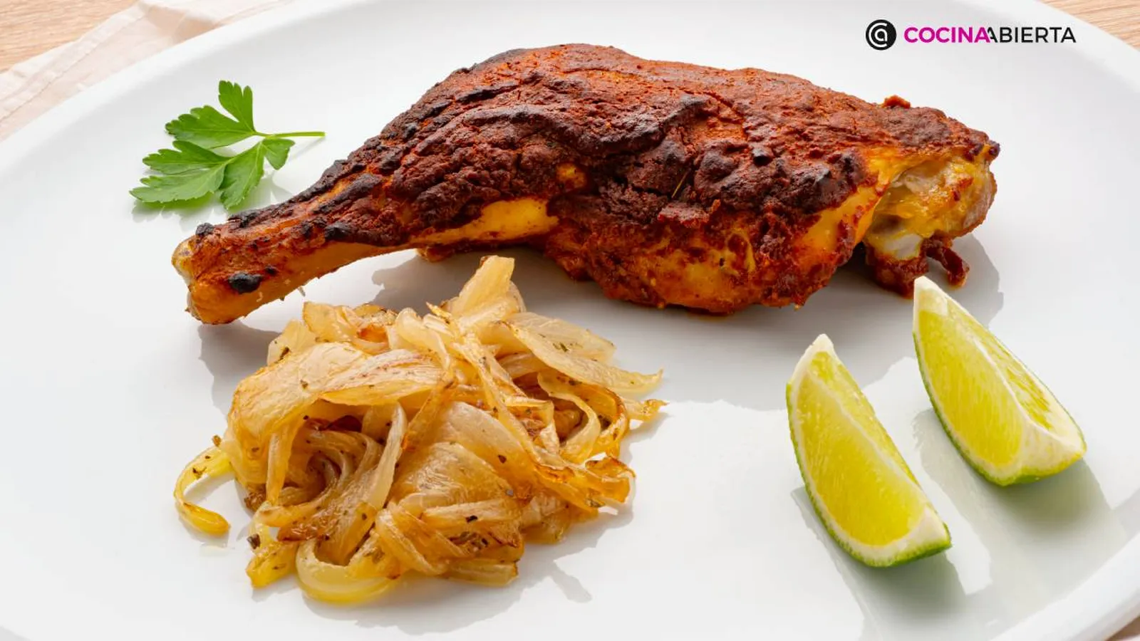 Sirve un muslo de pollo en cada plato y acompáñalos con la cebolla y los gajos de lima. Decora los platos con unas hojas de perejil.