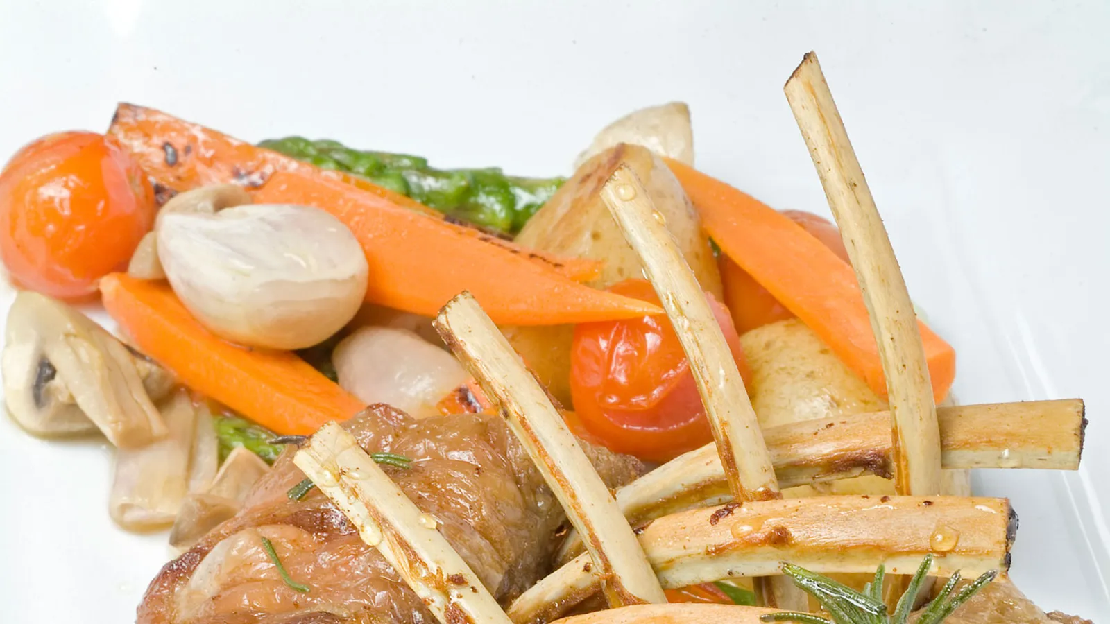 Para la guarnición, corta las zanahorias, las chalotas y los espárragos por la mitad y los champiñones en cuatro partes, saltéalos en una sartén con un chorrito de aceite. Reserva.