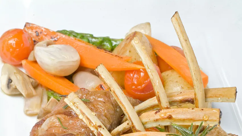 Receta de costillar de cordero cocinado al horno al aroma de miel y lavanda con verduras como guarnición.