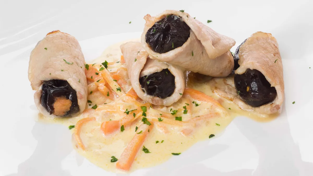 Receta de Eva Arguiñano de rollitos de lomo con ciruelas rellenas de tomate y salsa de soja cocinados en el horno y acompañados de salsa.