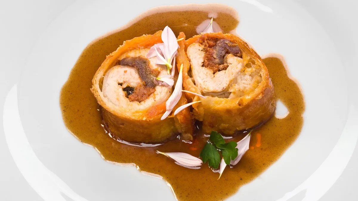 Bruno Oteiza prepara un plato de hojaldre con solomillo de cerdo relleno de datiles y sobrasada.