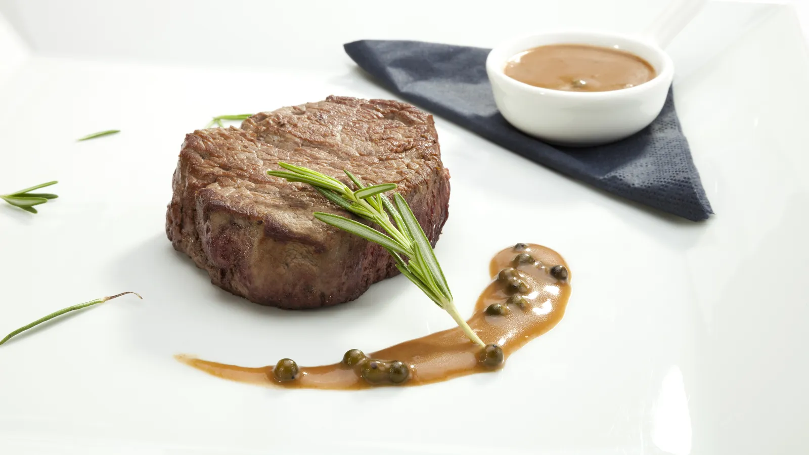 Receta de solomillo a la plancha con salsa de nata, mostaza y una mezcla de hierbas aromáticas: albahaca, estragón, perejil...