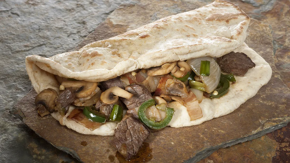 Calienta brevemente los panes árabes en el horno y sirve el salteado en el centro de cada pan para formar los tacos.