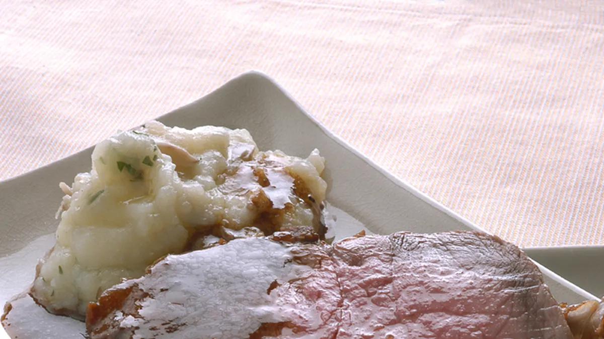 Receta de redondo de ternera con hongos, patata y cebolleta. Un plato de carne asada elaborado por Karlos Arguiñano.