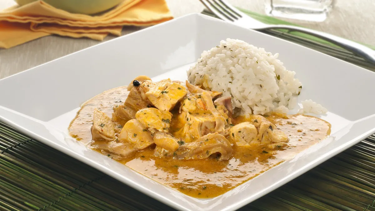 Sirve el vatapá de pollo en un plato y acompaña con el arroz.